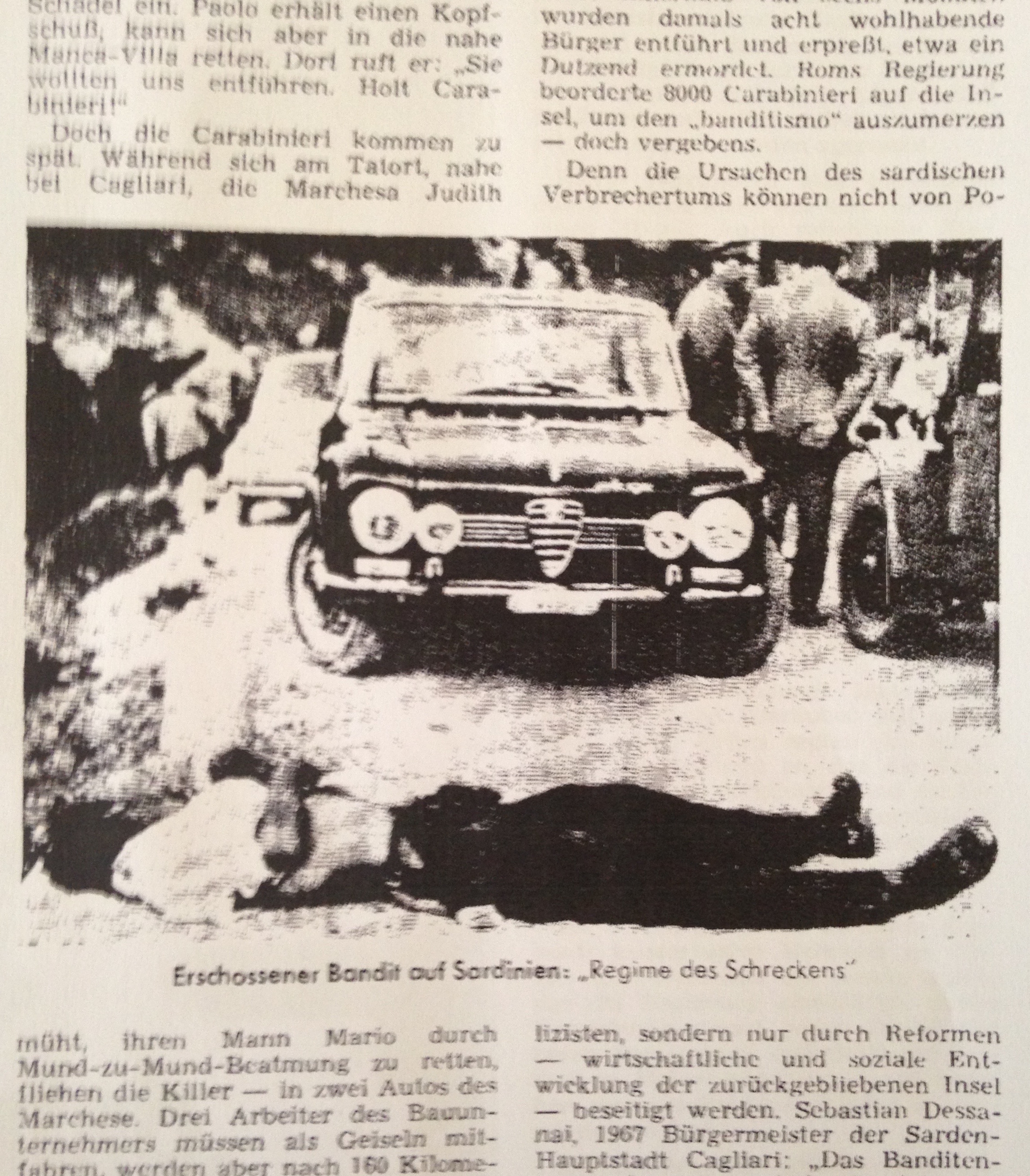 Brutale Gewalt in Sardinien. Auf der Straße ein erschossener Bandit.