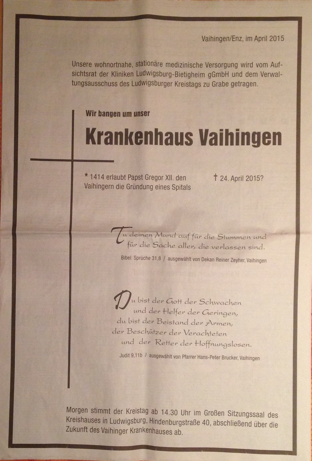 Vaihinger Kreiszeitung: Ganzseitige Todesanzeige zum Ende des Krankenhauses.